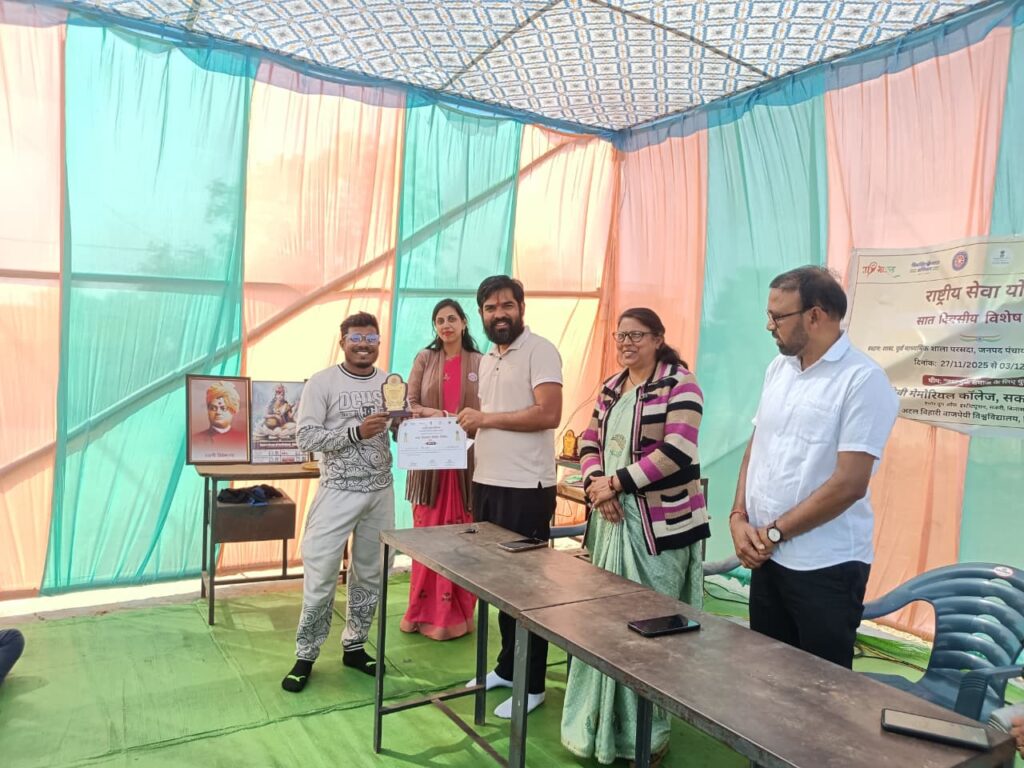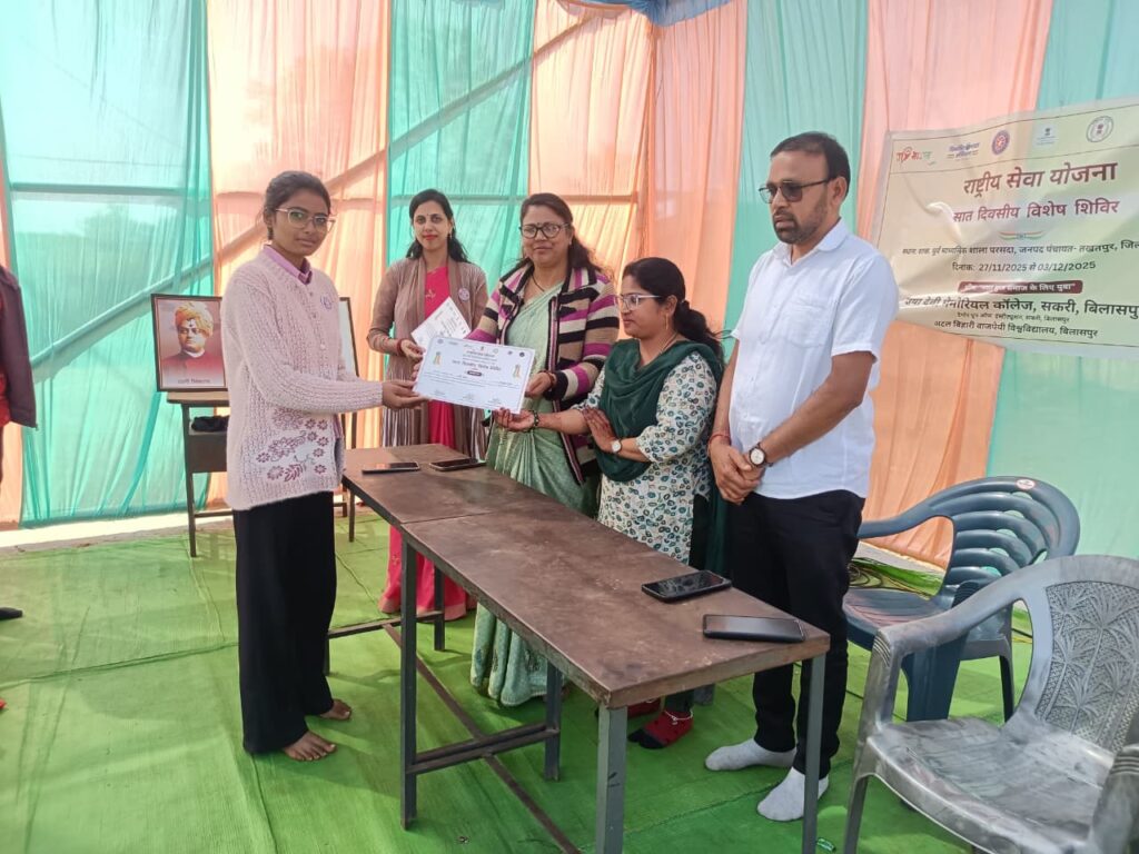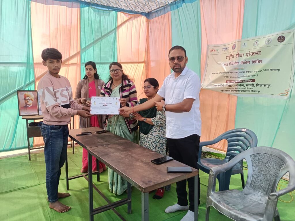 उषा देवी मेमोरियल कॉलेज, सकरी, बिलासपुर की राष्ट्रीय सेवा योजना इकाई द्वारा ग्राम परसदा में आयोजित सात दिवसीय विशेष शिविर का समापन आज उत्साहपूर्ण एवं गरिमामय वातावरण में संपन्न हुआ। पूरे सप्ताह चले इस शिविर में स्वयंसेवकों ने नशा मुक्ति, गुड टच बैड टच, SIR फॉर्म भरने में सहयोग,ग्राम विकास, स्वच्छता, स्वास्थ्य जागरूकता, शिक्षा तथा सामाजिक उत्तरदायित्व से संबंधित विविध गतिविधियों में सक्रिय सहभागिता निभाई।
