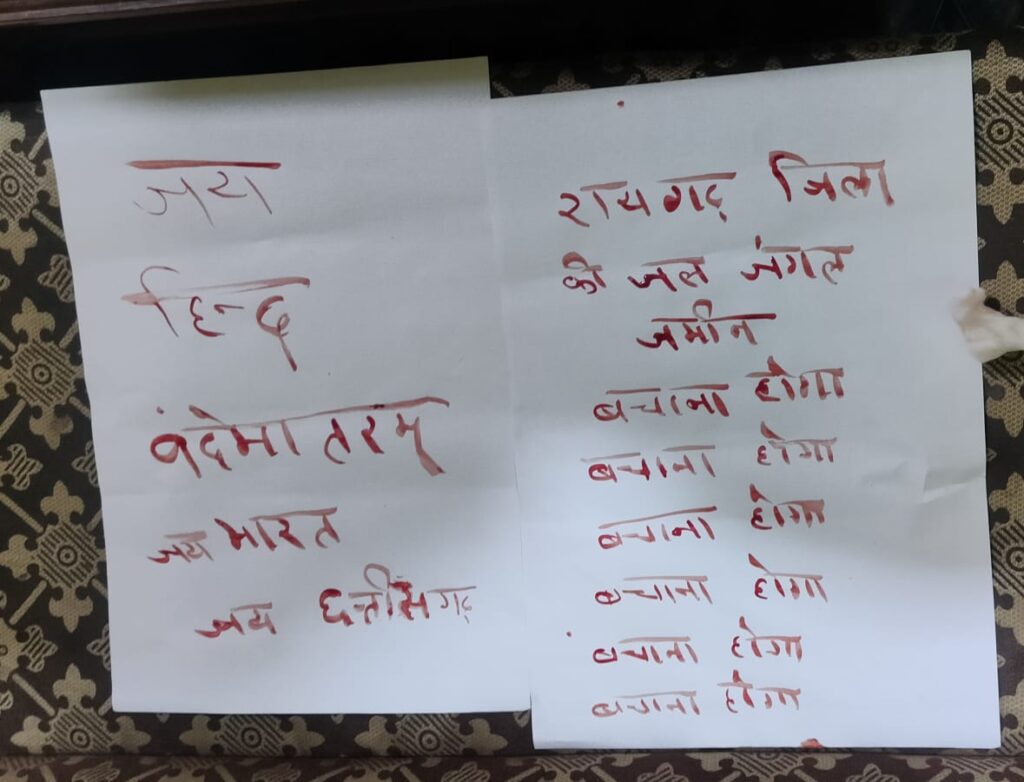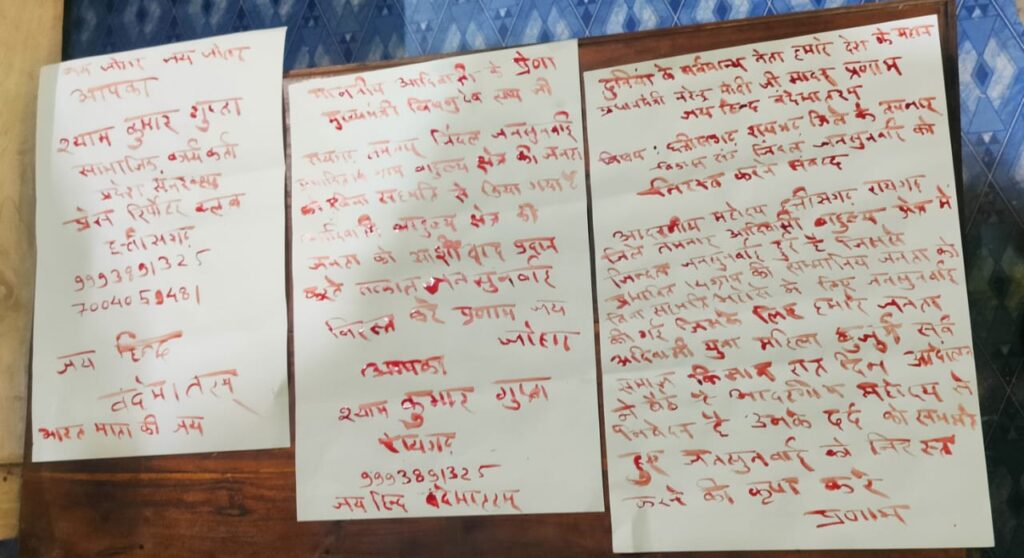 तमनार की जन सुनवाई जनता हित में निरस्त करने सामाजिक कार्यकर्ता श्याम गुप्ता ने खून से लिखा प्रधानमंत्री व मुख्यमंत्री को पत्र