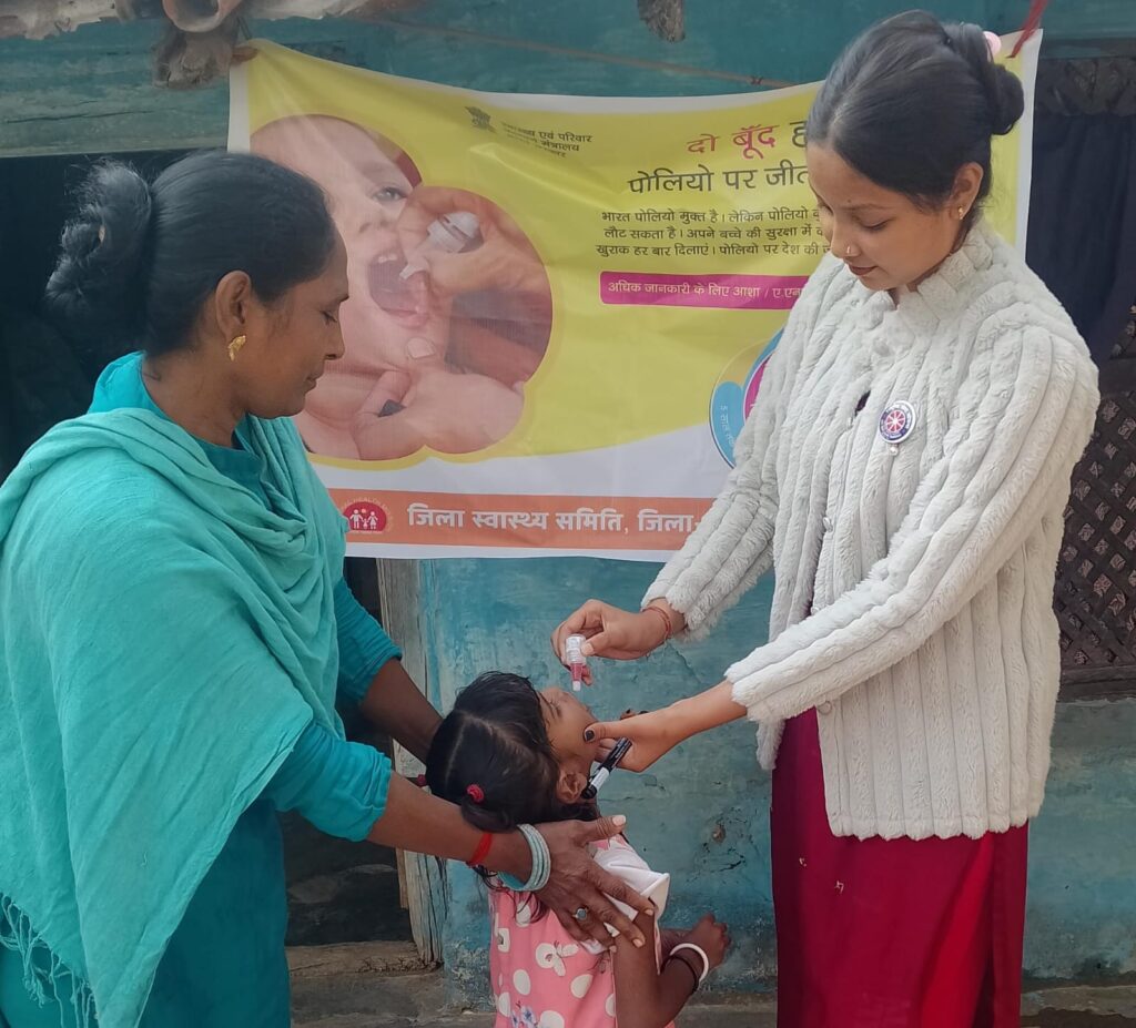 इसी प्रकार स्वयंसेविका वर्षा साहू ने आंगनबाड़ी केंद्र चांटीडीह, केंद्र क्रमांक 86 में कार्यकर्ता शारदा साहू के साथ बच्चों को पल्स पोलियो की खुराक पिलाने में सहयोग किया।