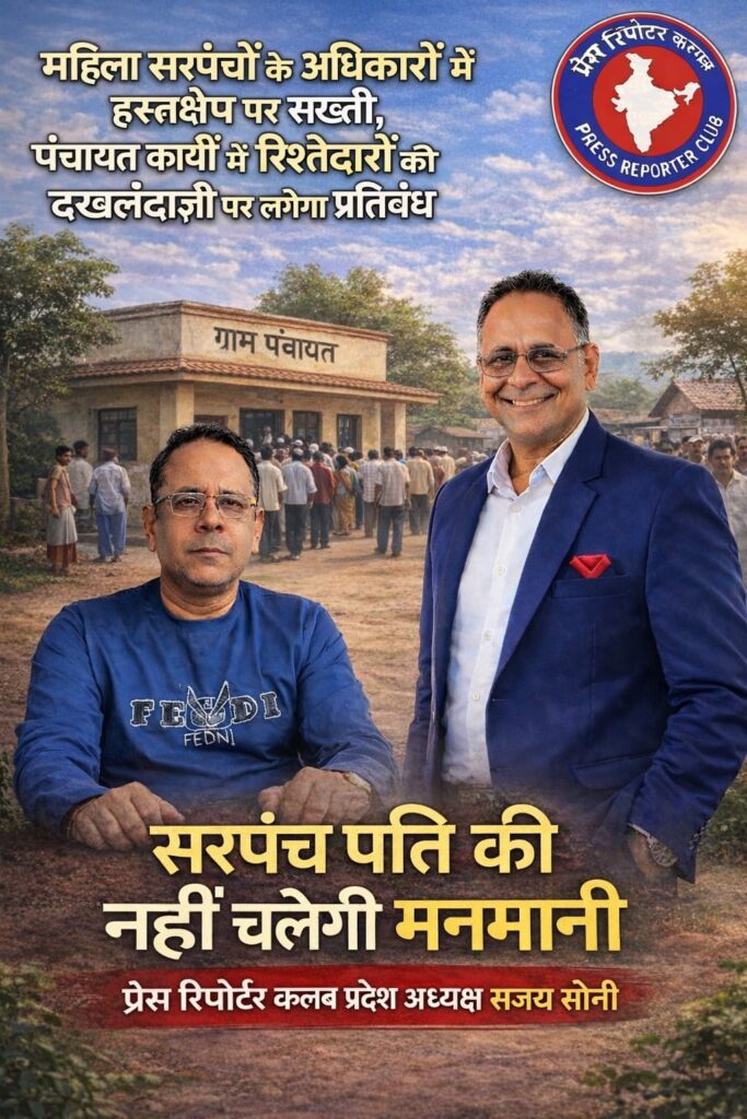 इधर प्रेस रिपोर्टर क्लब के प्रदेश अध्यक्ष संजय सोनी ने इस विषय पर कड़ा रुख अपनाते हुए कहा कि पंचायतों में महिलाओं को आरक्षण देकर उन्हें नेतृत्व और निर्णय लेने का अधिकार दिया गया है, लेकिन कई जगह “सरपंच पति” या अन्य रिश्तेदारों की दखलंदाजी से यह व्यवस्था कमजोर हो रही है। उन्होंने कहा कि यदि पंचायतों में इस तरह की अनधिकृत दखलअंदाजी जारी रही तो यह लोकतांत्रिक व्यवस्था और महिला सशक्तिकरण दोनों के लिए गंभीर खतरा साबित होगा।