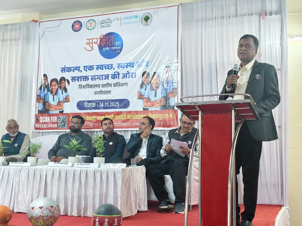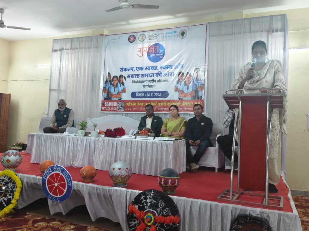 बिलासपुर। राष्ट्रीय सेवा योजना (NSS) एवं यूनिसेफ छत्तीसगढ़ के संयुक्त तत्वावधान में डीएलएस कॉलेज में विश्वविद्यालय स्तरीय प्रशिक्षण कार्यक्रम का आयोजन प्रातः 10 बजे से शाम 4 बजे तक किया गया। पंजीयन एवं अल्पाहार के बाद प्रथम सत्र का शुभारंभ यूनिसेफ के स्टेट प्रभारी अभिषेक कुमार त्रिपाठी और अटल बिहारी वाजपेयी विश्वविद्यालय बिलासपुर के एनएसएस समन्वयक डॉ. मनोज कुमार सिन्हा द्वारा मां सरस्वती एवं कॉलेज के संस्थापक स्व. दसरथलाल शर्मा के चित्र पर माल्यार्पण कर किया गया।